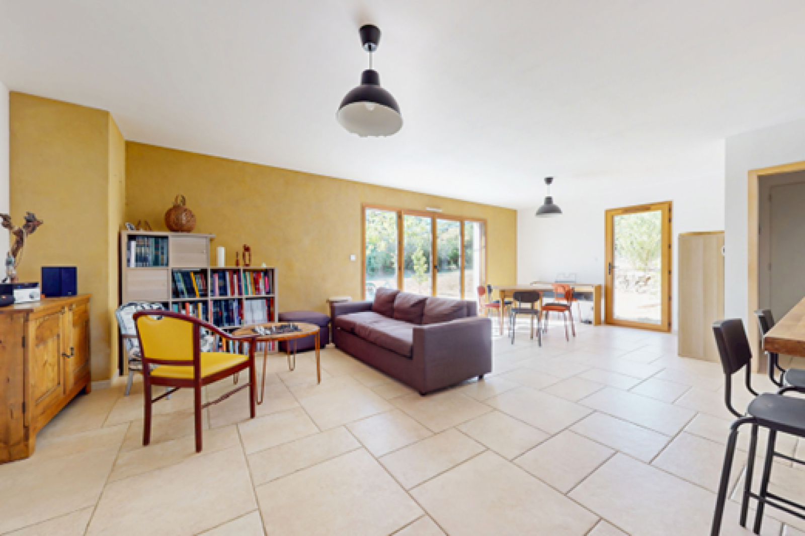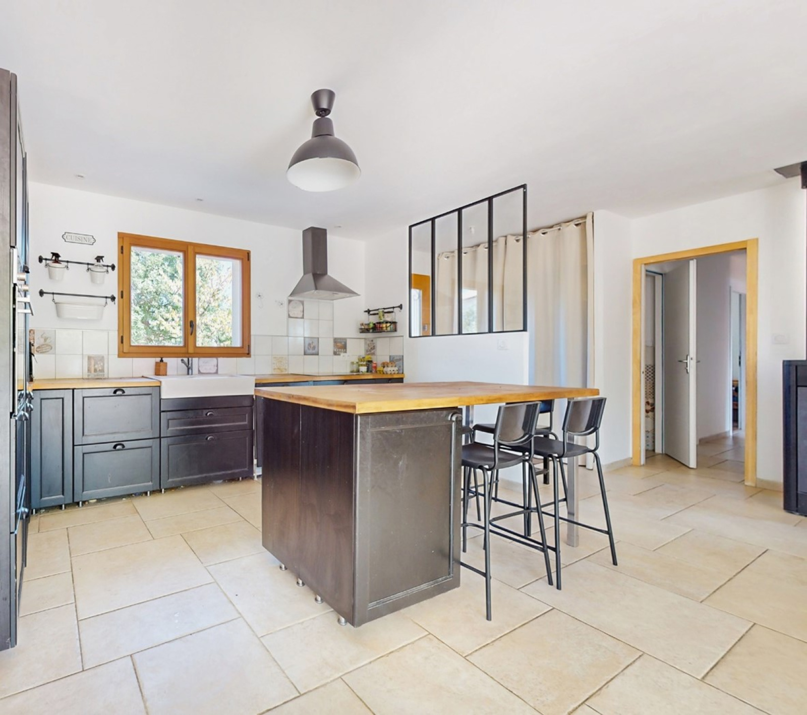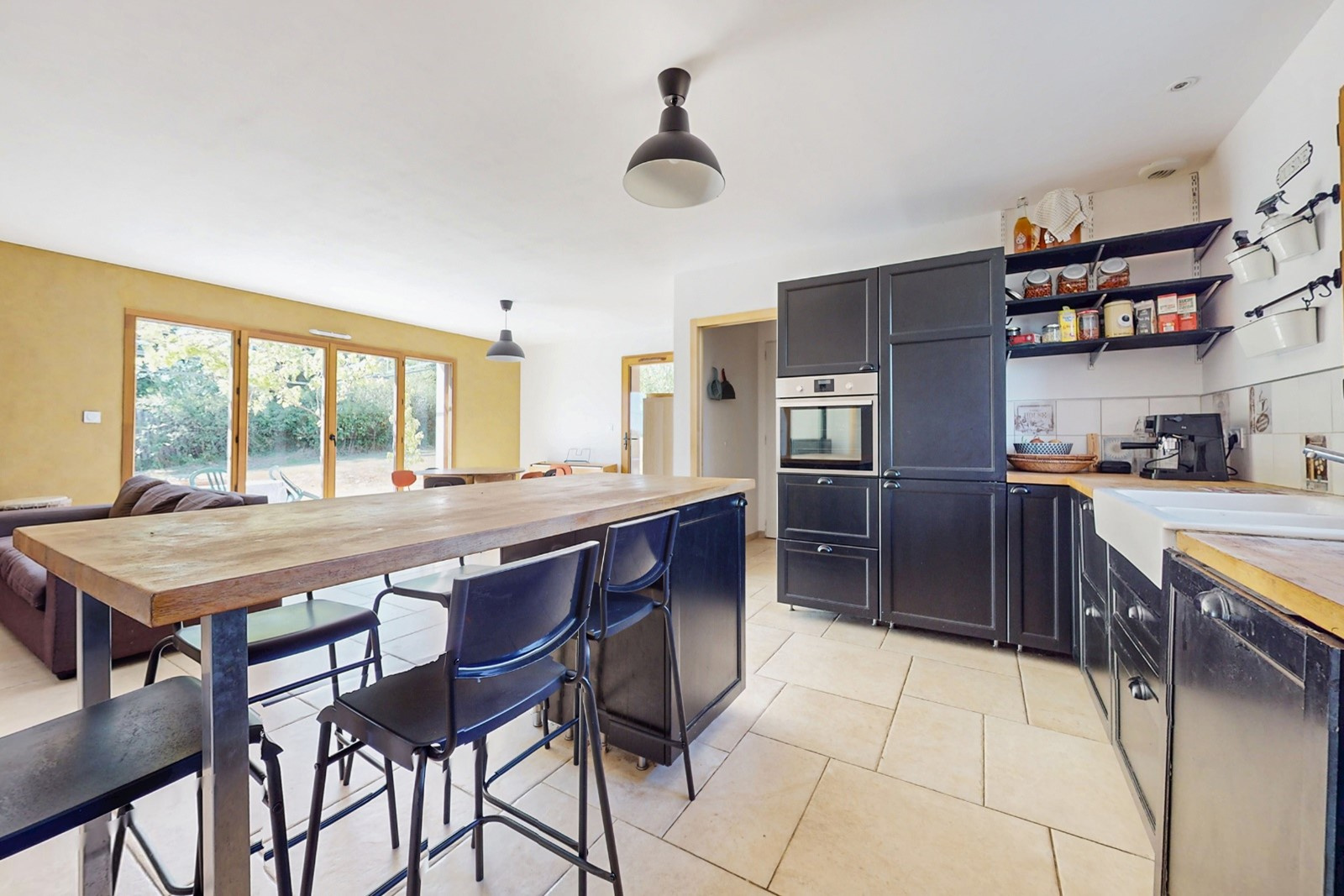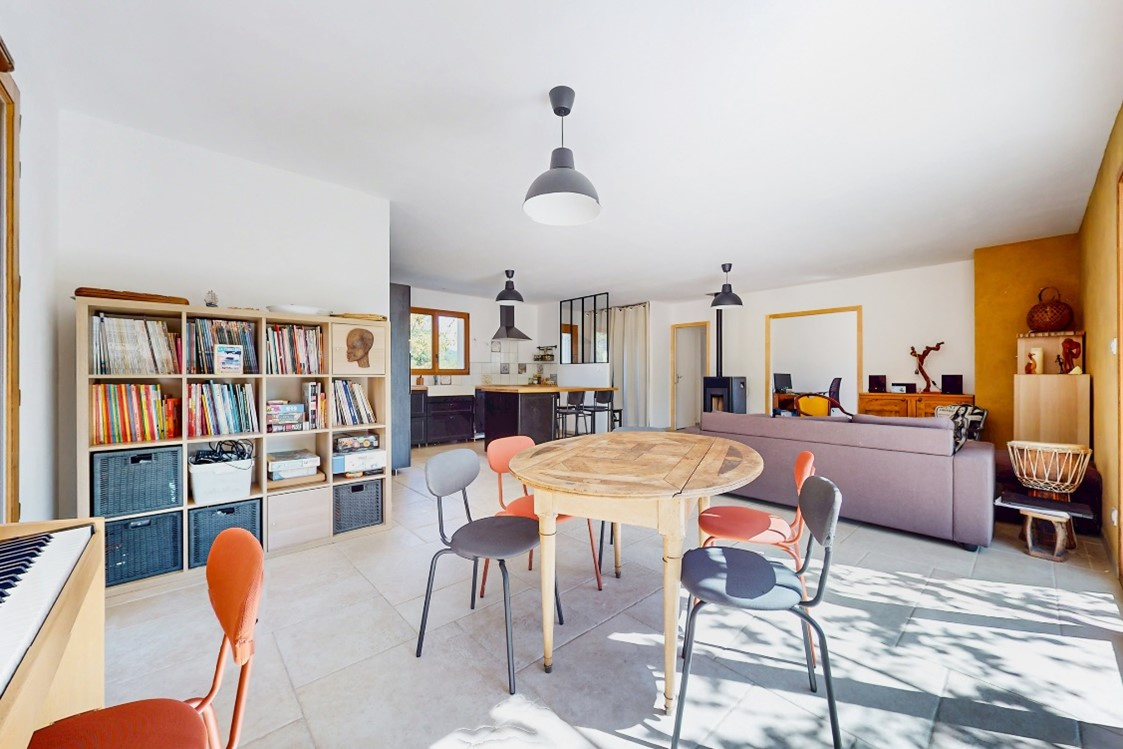 Un espace de vie avec cuisine équipée donnant sur le jardin et sa terrasse.