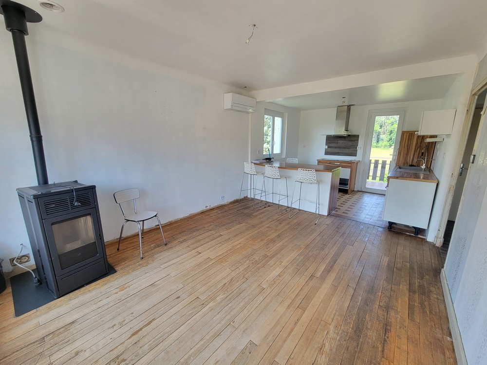 Equipements : Chauffage par poêle à granules et radiateurs électriques, Climatision réversible dans la pièce de vie et dans deux chambres, fenêtres double vitrage.