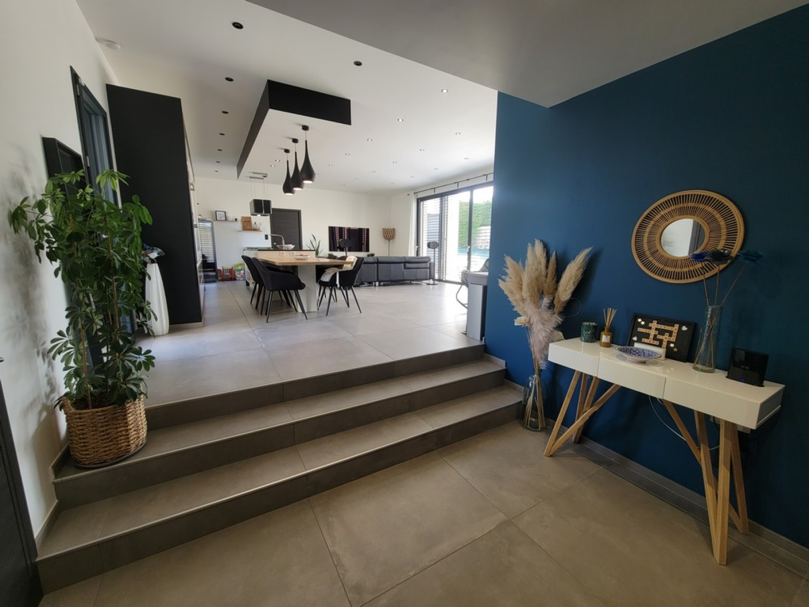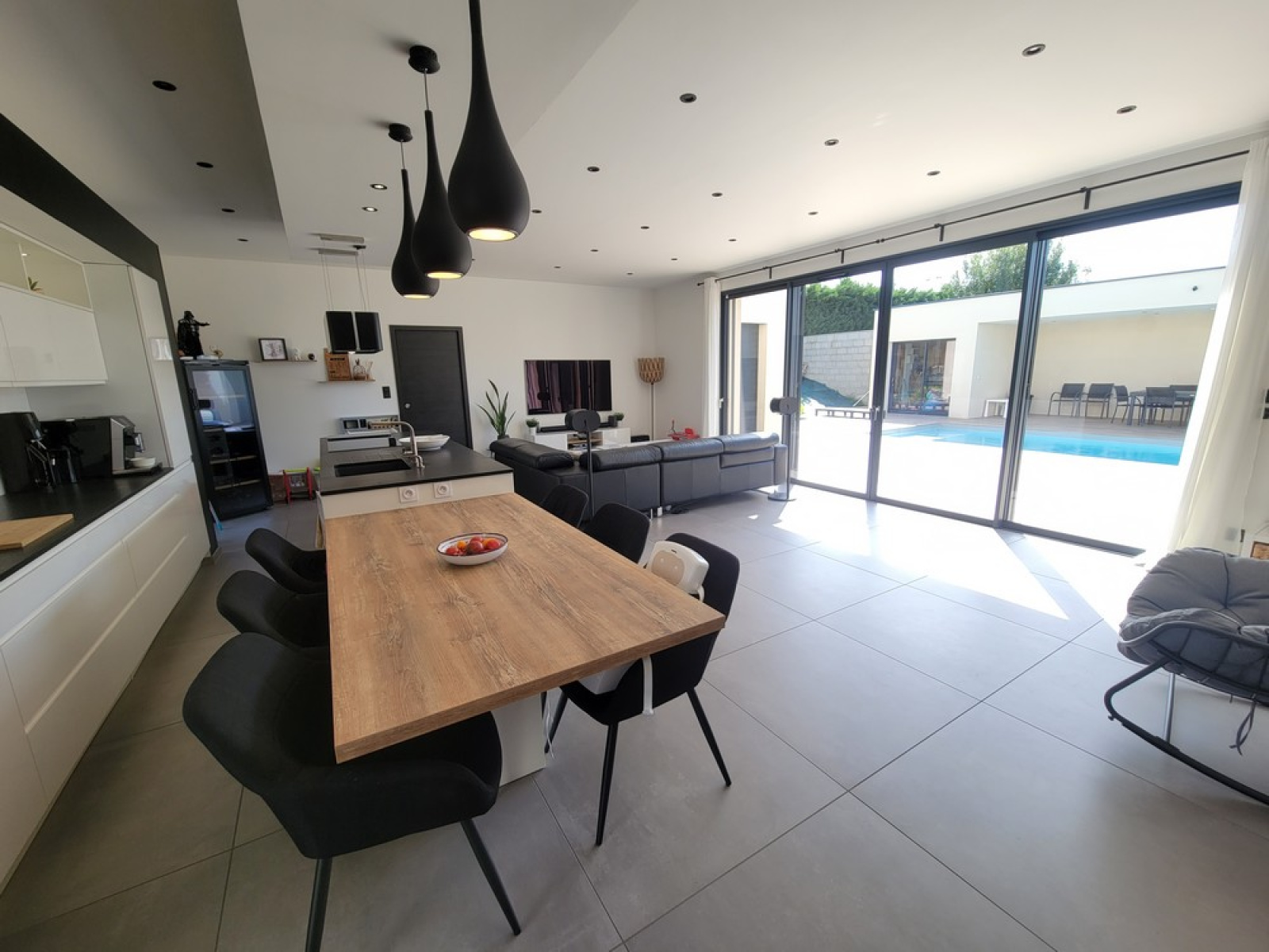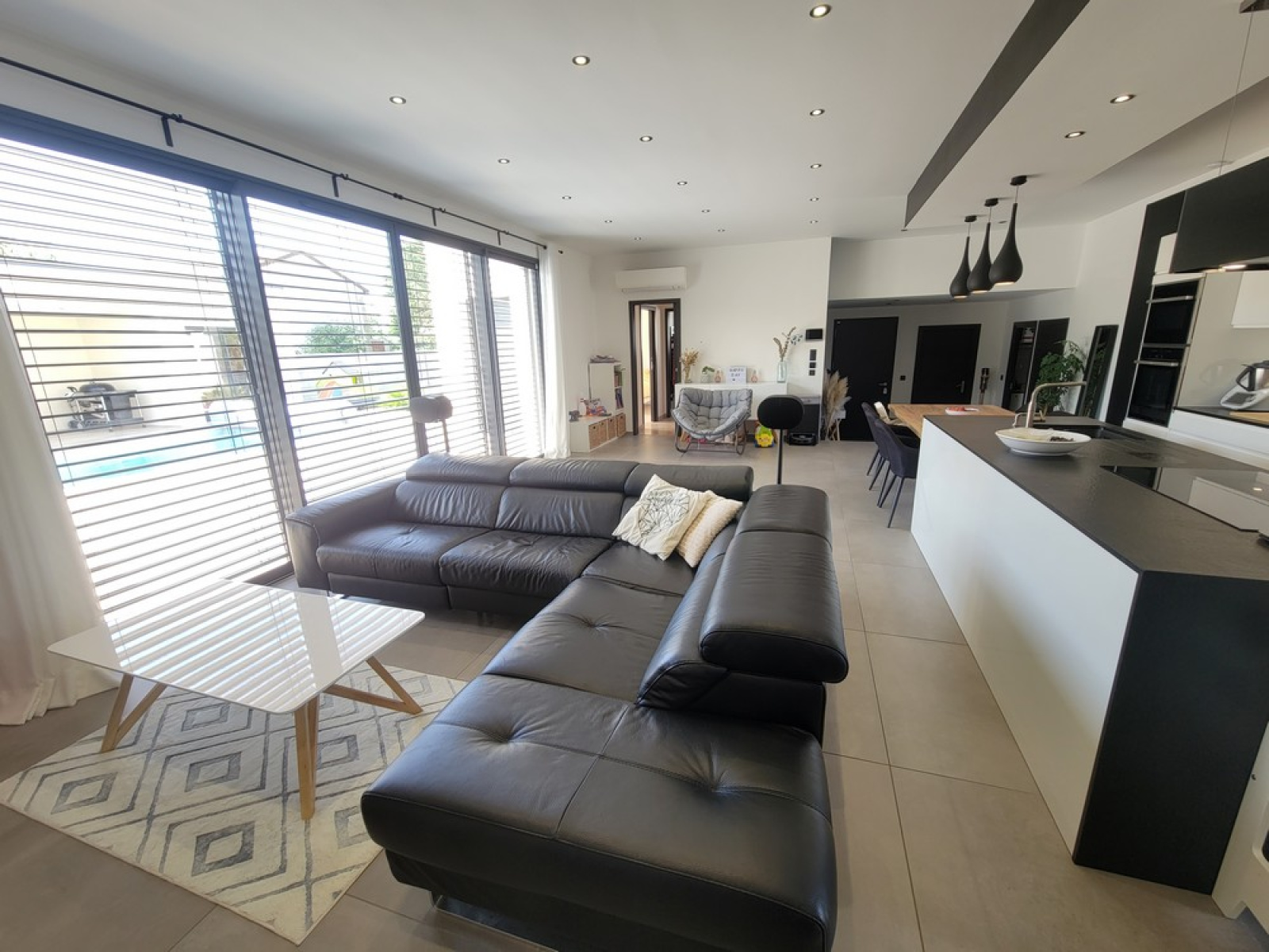 D'une très belle pièce de vie baignée de lumière, dotée d'une cuisine entièrement équipée et d'un accès direct à la terrasse et la piscine par une large baie vitrée,