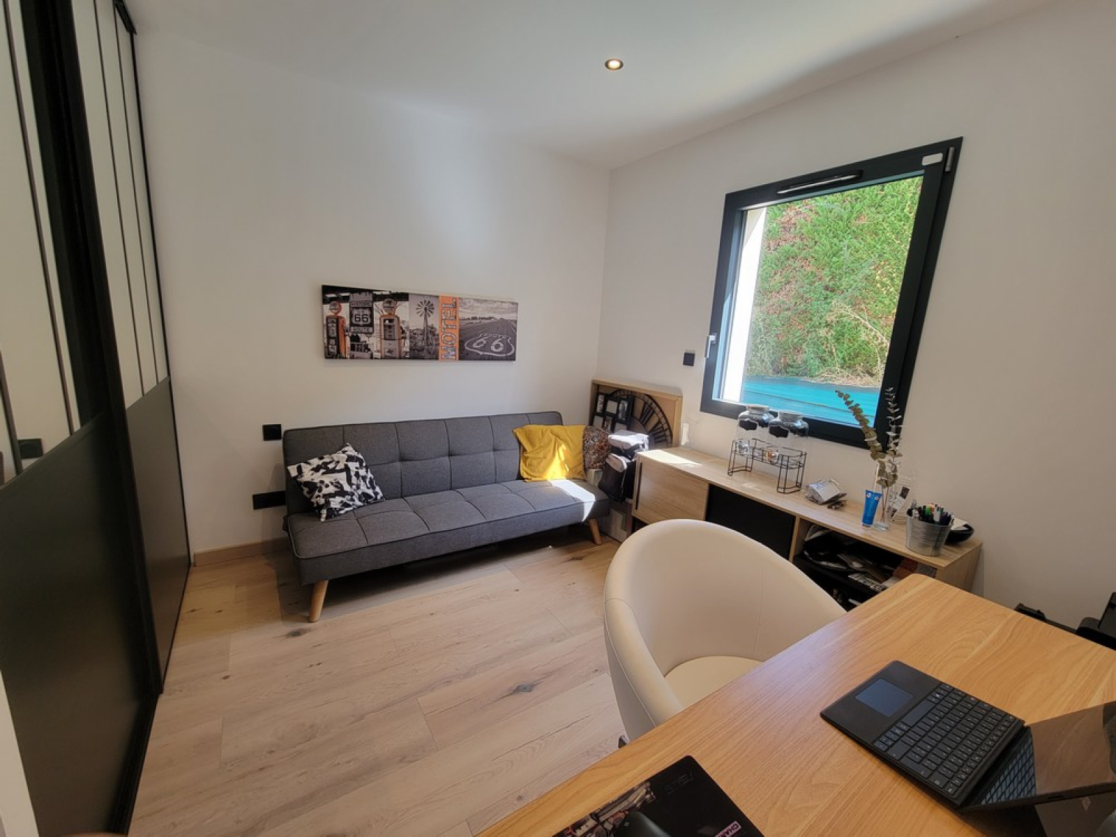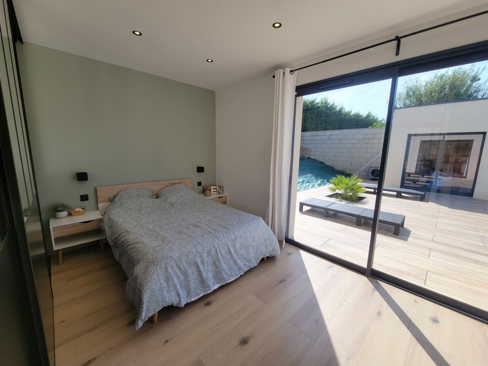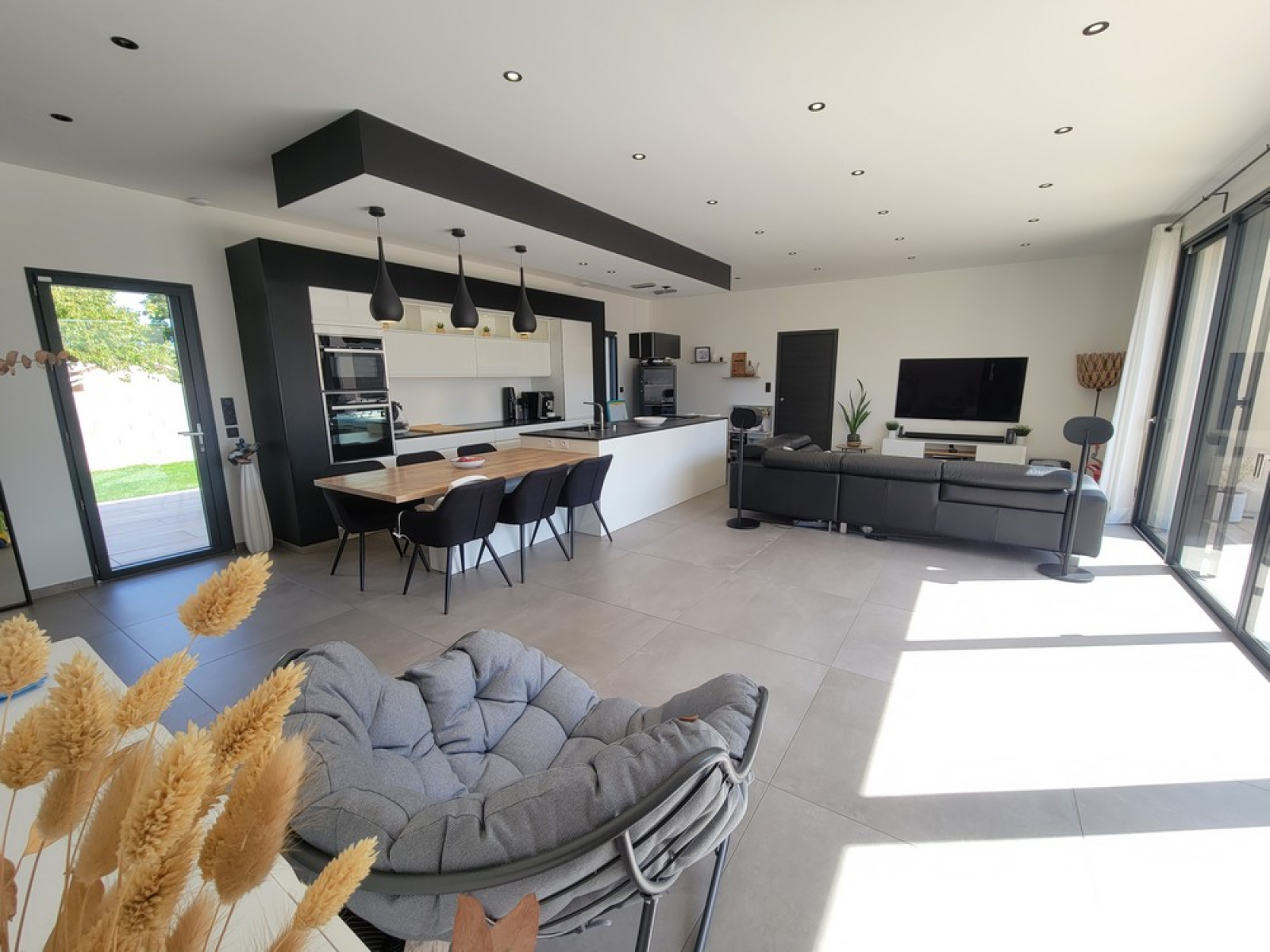 D'une très belle pièce de vie baignée de lumière, dotée d'une cuisine entièrement équipée et d'un accès direct à la terrasse et la piscine par une large baie vitrée,
