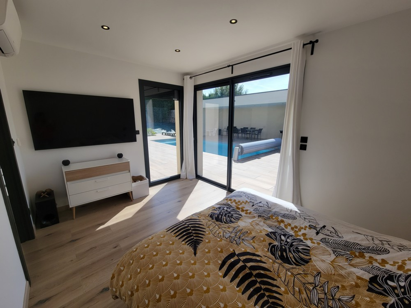Des équipements et prestations haut de gamme : Villa connectée SOMFY, porte blindée avec ouverture domotisée, système d'empreinte digitale et verrouillage automatique, alarme, chauffage au sol par pompe à chaleur DAIKIN, climatisation réversible dans chaque pièce, fenêtres et volets roulants électriques en alu.