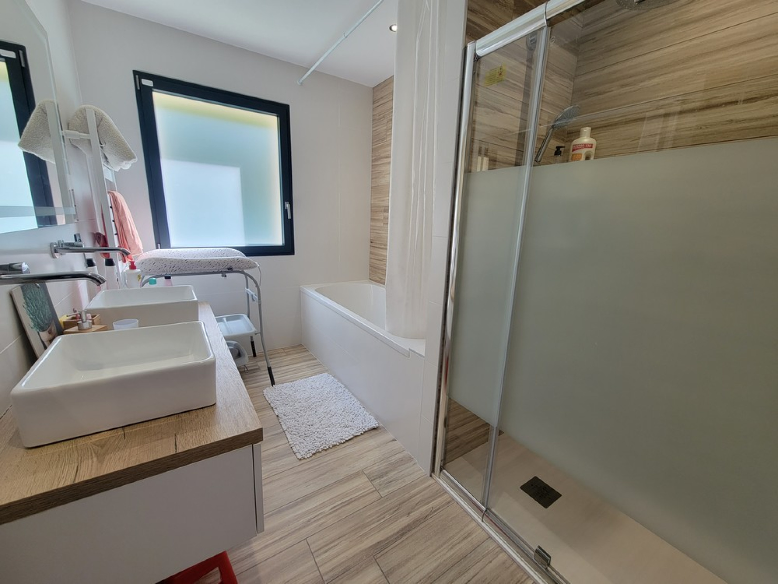 D'un espace nuit composé de 3 chambres avec placard, une salle de bain avec douche et baignoire, un wc,