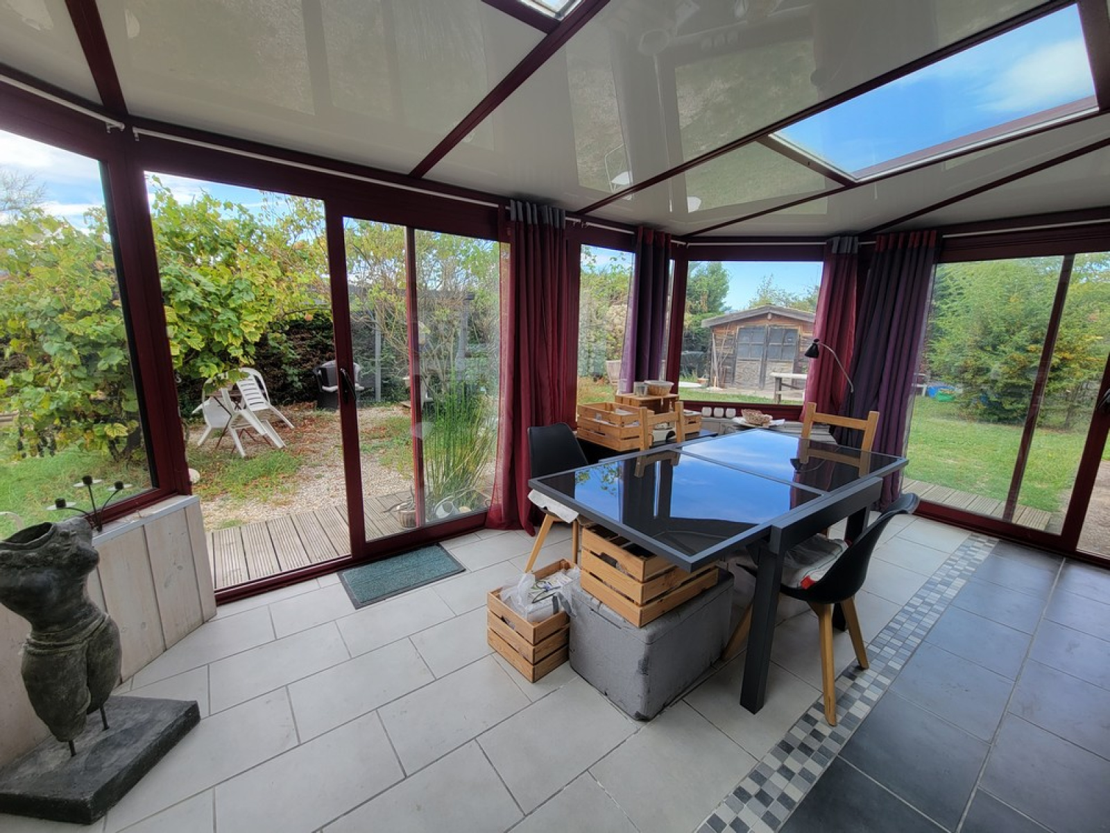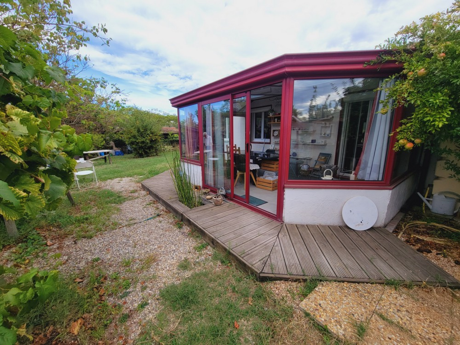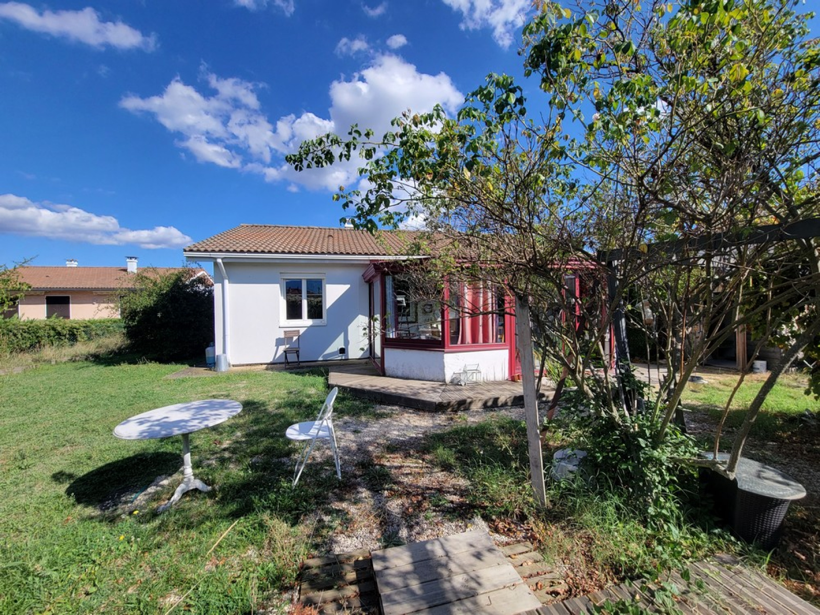 Charmante villa de plain-pied composée d'une belle pièce de vie lumineuse avec une cuisine équipée ouverte sur le séjour et donnant sur une véranda de 15 m² env.